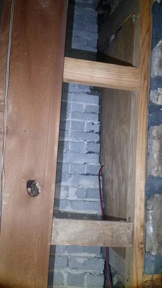 Looking in from the left, behind the facade. Note that same power cord coming through, for reference. The plywood sheet on the right of this picture is behind the stone facade: