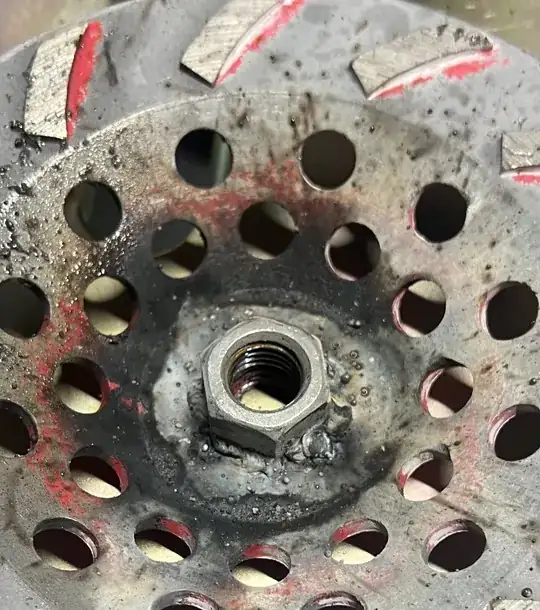 I have a grinder with a Dewalt diamond cup wheel I have been using to remove cosmetic issues on the floor of my basement before staining the floor. I am grinding the whole floor. I am about 1/2 done and need to get the diamond cup off the grinder but I am unable to do so. It is a reverse screw, yes I know I am turning it the right way, I've taken it off twice before.