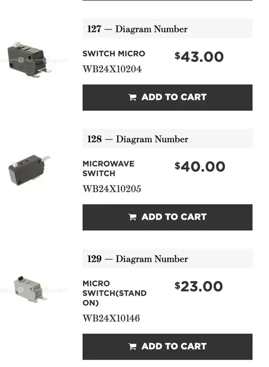 Now here's something that perplexes me: in the GE Parts catalog items 127 and 129 are both "normally open" switches. They look identical but have different part numbers. If you look at the zoomed in photo on each part's catalog page, they are both "K3WA" type that can easily be found on Amazon.