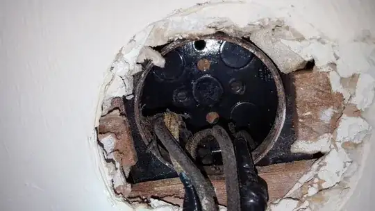 I rent an old 1920's built house where an old hanging light fixture junction box was covered with a blank panel. I want to hang a ceiling fan in this living room, but when exposed I see this old junction box that is really in the plaster and would be a huge hassle to replace.
