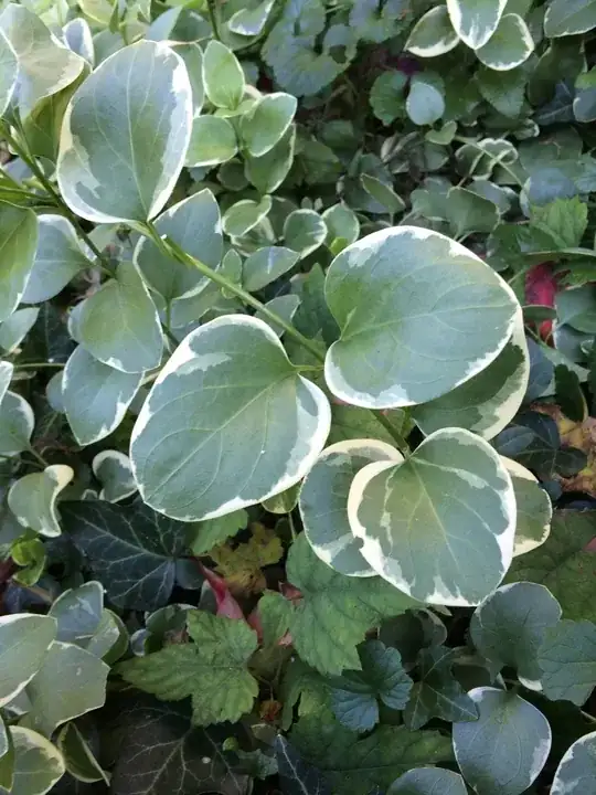 It has light green, glossy, spade shaped (ovate), entire, opposite, and white edged variegated evergreen leaves.