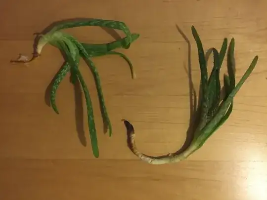 Two succulent Aloe vera shoots easily fell off a friend's aloe plant from readjusting a pot. This plant is potentially under watered and, from looking at the main plant or by just observing the two crowns below, this plant is pretty etiolated and receives little sun.