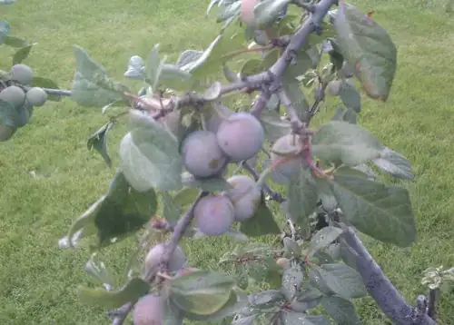 My mom thinks it's a Mirabelle plum tree (Prunus domestica), but those appear to produce orange plums. It's in southeastern Idaho, gets full sun from about 9 AM until sunset.