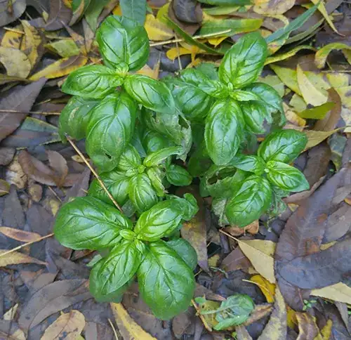 That might well be slug or snail damage - given there's lots of leaf litter laying around your plant, you've created a perfect environment for slugs to hide beneath during the day, and then appear at night and snack on your basil. If you want to confirm that's the problem, go out with a torch at night, especially a damp night, and see what's around.