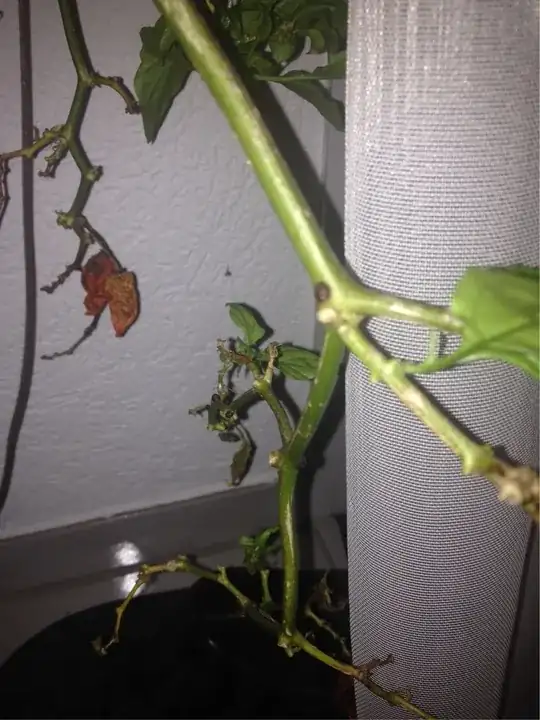 There appears to be a long standing insect infestation, possiby whitefly (does anything rise up and fly about when you go near or disturb the plant?) or scale infestation of some sort. The leaves look somewhat sticky, they're unhealthy with evidence of damage on the stems as well - there are white dots on the upper surface of the leaves and I think there are some on a few stems as well, but the photo doesn't magnify well, it blurs, so impossible to decide quite what they are. You might check beneath the leaves and inspect all stems thoroughly to see if you see any scale, but if you find touching the plant causes a rising up and flying about of whatever this pest is, its likely one of the aphids like whitefly.