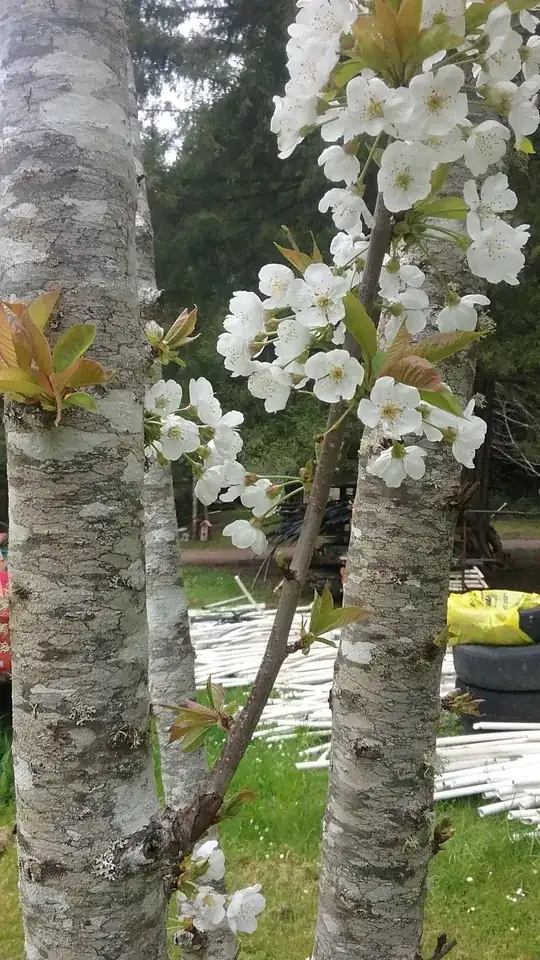 Yes this is an apple; Malus pumila. This is not the bark I know but after a search, I guess it is possible. The flowers and the stem you show are apple. What I'd like to see is the rest of the tree to include the crown and shape of the tree. a close up of the leaves but from here sure looks like apple leaves. Those flowers are definitely apple. How weird. Send more pictures so that we can see the health of this tree and be able to give you suggestions so that you might be able to get fruit. How did you think of apple, by the way? There will be others to answer this question, are you able to send more pictures being so new?