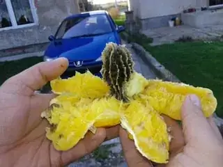 Definitely looks like something from a sci fi/horror movie! Black areas within oranges are usually caused by a fungal pathogen - it enters most often at the 'navel' end of the orange and then spreads inside the fruit in varying degrees. It most often spreads up the central area, but can appear as small black areas in some of the cells of the orange. However,there is usually a small black or brown spot on the skin outside too, and internally, the spread is definitely sooty black, not greenish grey.