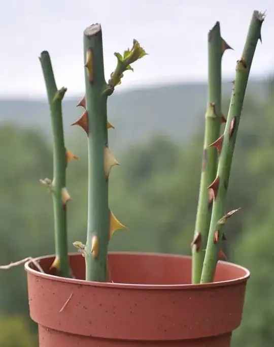 Similar this question I potted rose-cuttings using the described in BBC's Gardener's World (cutting August-shoots in 20cm long "sticks" and place them into drained soil). I did this in the end of August and two of the stems started to build side-shoots. Not sure whether rooting has already started though.