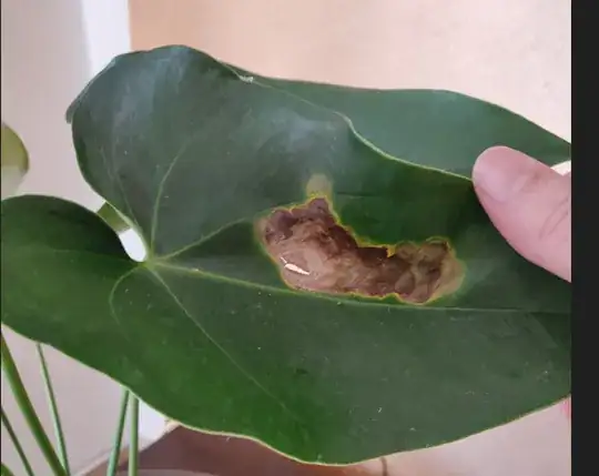 This is fungus/bacteria/virus on an Anthurium which is brought on by the root ball being too wet for too long. An anerobic agent finds wet, dark and no oxygen to be a great place to live and then moves up the plant to the leaves. Key identification points which work across many species are: