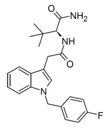 ADB-FUBIATA (AD-18, FUB-ACADB, ADB-FUBIACA) is a synthetic cannabinoid compound first identified in 2021. It is closely related in structure to the older compound ADB-FUBICA but with the amide linker group extended by the addition of a methylene bridge. It started to be sold as an ingedient in grey-market synthetic cannabis blends following the introduction of legislation in China which for the first time introduced general controls on various classes of synthetic cannabinoids,[2] but did not encompass compounds where the linker group had been extended in this fashion. ADB-FUBIATA has many times lower affinity for cannabinoid receptors than ADB-FUBICA with an EC50 of only 635 nM at CB1, but retains full agonist activity at this target, while being practically inactive at CB2.[3][4]