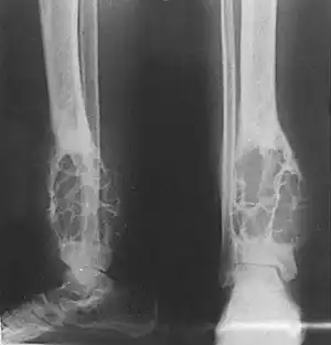 | X-ray (side and front views) showing an adamantinoma in the large bone of lower leg, near the ankle. | |