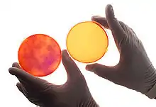 This photo shows the sterilisation effects of negative air ionization on a chamber aerosolised with Salmonella enteritidis. The left sample is untreated; the right, treated.