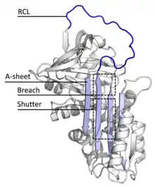 Alpha-1 antitrypsin (white) with highlighted 'reactive centre loop' (blue) and A-sheet (light blue). (PDB: 1QLP)