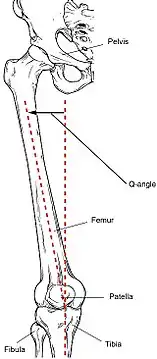 Femur with Q angle: the angle formed by a line drawn from the anterior superior iliac spine through the center of the patella and a line drawn from the center of the patella to the center of the tibial tubercle