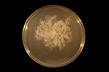 B. mycoides are rod-shaped cells about 1 micron across and 3 to 5 microns long. When growing, they either grow as single cells or form loosely connected chains of cells.[1] They are not motile. B. mycoides can survive with or without oxygen and grows at temperatures ranging from 10 to 15 °C to 35–40 °C.[1] B. mycoides is distinguished from a number of other Bacillus species in the unusual morphology of the colonies it forms when grown on agar plates. B. mycoides forms white opaque colonies that are characteristically hairy in appearance (often referred to as "rhizoid").[1] These colonies rapidly spread to fill the plate and are characterized by a repeating spiral pattern.[1][2] B. mycoides has the unusual property of being able to respond to mechanical force and surface structure variations in the media on which it is growing.[3]