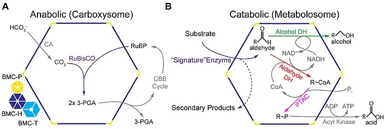 In 2014 it was proposed that the despite their functional diversity, the majority of metabolosomes share a common encapsulated chemistry driven by three core enzymes: aldehyde dehydrogenase, alcohol dehydrogenase, and phosphotransacylase.[6][25][60][61] Because aldehydes can be toxic to cells[53] and/or volatile,[62] they are thought to be sequestered within the metabolosome. The aldehyde is initially fixed to coenzyme A by a NAD+-dependent aldehyde dehydrogenase, but these two cofactors must be recycled, as they apparently cannot cross the shell.[63][64] These recycling reactions are catalyzed by an alcohol dehydrogenase (NAD+),[63] and a phosphotransacetylase (coenzyme A),[64] resulting in a phosphorylated acyl compound that can readily be a source of substrate-level phosphorylation or enter central metabolism, depending on if the organism is growing aerobically or anaerobically.[53] It seems that most, if not all, metabolosomes utilize these core enzymes. Metabolosomes also encapsulate another enzyme that is specific to the initial substrate of the BMC, that generates the aldehyde; this is the defined signature enzyme of the BMC.[6][25]