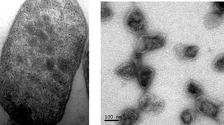 Electron micrographs showing alpha-carboxysomes from the chemoautotrophic bacterium Halothiobacillus neapolitanus: (A) arranged within the cell, and (B) intact upon isolation. Scale bars indicate 100 nm.[54]