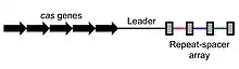 The CRISPR array is made up of an AT-rich leader sequence followed by short repeats that are separated by unique spacers.[77] CRISPR repeats typically range in size from 28 to 37 base pairs (bps), though there can be as few as 23 bp and as many as 55 bp.[78] Some show dyad symmetry, implying the formation of a secondary structure such as a stem-loop ('hairpin') in the RNA, while others are designed to be unstructured. The size of spacers in different CRISPR arrays is typically 32 to 38 bp (range 21 to 72 bp).[78] New spacers can appear rapidly as part of the immune response to phage infection.[79] There are usually fewer than 50 units of the repeat-spacer sequence in a CRISPR array.[78]