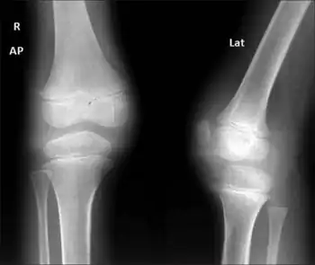 Large acetabular cysts are common in this condition.[2] Other features include periarticular osteopenia, squaring of metacarpals and phalanges and bilateral joint effusions.