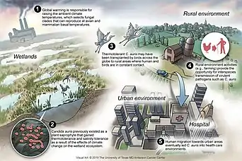 - ↑ Casadevall A, Kontoyiannis DP, Robert V (July 2019). "On the Emergence of Candida auris: Climate Change, Azoles, Swamps, and Birds". mBio. 10 (4): e01397–19. doi:10.1128/mBio.01397-19. PMC 6650554. PMID 31337723.