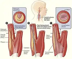 Trans-carotid artery stenting involves a surgical incision at the base of the neck over the common carotid artery. It is performed under either local or general anesthesia. Wire access is obtained at that location and used to deliver the stent to the internal carotid artery. Cerebral protection is usually obtained by flow reversal - the common carotid artery is clamped, and arterial blood from the internal carotid is run through a filter and returned to a femoral vein during the highest risk portions of the procedure.[4]