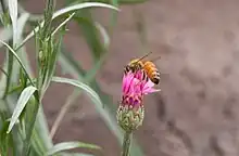 The pollen of Centaurea cyanus is used by several different insect species. Insects of the orders Hymenoptera and Diptera are particularly attracted by the flower.[19] As Centaurea cyanus is a self-incompatible species, it needs external pollination. The nectar of Centaurea cyanus is very sweet with a sugar content of 34%. Due to its high sugar production of up to 0.2 mg sugar per day and flower, the species is highly appreciated by beekeepers.[20]