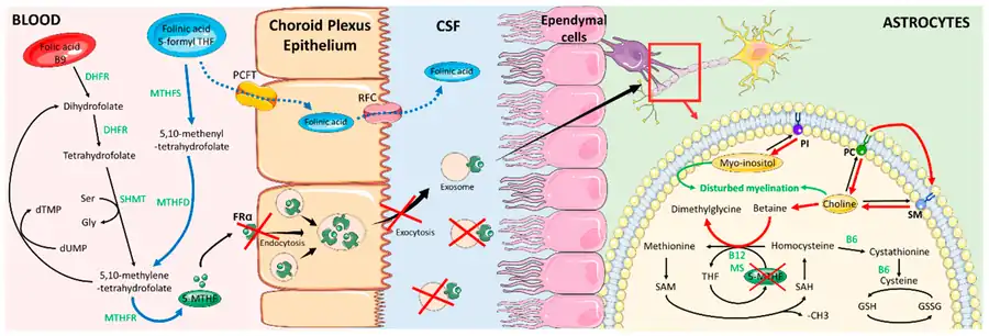 - ↑ Serrano M, Pérez-Dueñas B, Montoya J, Ormazabal A, Artuch R (2012). "Genetic causes of cerebral folate deficiency: clinical, biochemical and therapeutic aspects". Drug Discovery Today. 17 (23–24): 1299–1306. doi:10.1016/j.drudis.2012.07.008. PMID 22835503.