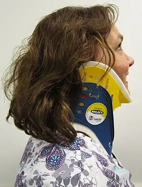 A cervical collar, also known as a neck brace, is a medical device used to support and immobilize a person's neck. It is also applied by emergency personnel to those who have had traumatic head or neck injuries,[1] although they should not be routinely used in prehospital care.[2][3] They can also be used to treat chronic medical conditions.