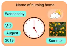 Design draft for a reality orientation board used to help people with dementia or in post-operative delirium.