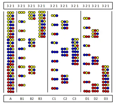 Positional scanning was introduced independently by Furka et al.[32] and Pinilla et al.[33] The method is based on the synthesis and testing of series of sublibraries. in which a certain sequence position is occupied by the same amino acid. The figure shows the nine sublibraries (B1-D3) of a full peptide trimer library (A) made from three amino acids. In sublibraries there is a position which is occupied by the same amino acid in all components. In the synthesis of a sublibrary the support is not divided and only one amino acid is coupled to the whole sample. As a result, one position is really occupied by the same amino acid in all components. For example, in the B2 sublibrary position 2 is occupied by the "yellow" amino acid in all the nine components. If in a screening test this sublibrary gives positive answer it means that position 2 in the active peptide is also occupied by the "yellow" amino acid. The amino acid sequence can be determined by testing all the nine (or sometime less) sublibraries.