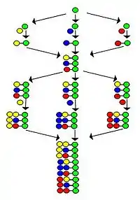 The procedure is illustrated by the synthesis of a dipeptide library using the same three amino acids as building blocks in both cycles. Each component of this library contains two amino acids arranged in different orders. The amino acids used in couplings are represented by yellow, blue and red circles in the figure. Divergent arrows show dividing solid support resin (green circles) into equal portions, vertical arrows mean coupling and convergent arrows represent mixing and homogenizing the portions of the support.