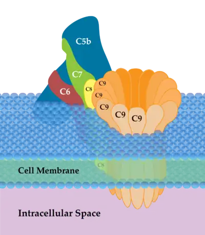 MAC is composed of a complex of four complement proteins (C5b, C6, C7, and C8) that bind to the outer surface of the plasma membrane, and many copies of a fifth protein (C9) that hook up to one another, forming a ring in the membrane. C6-C9 all contain a common MACPF domain.[6] This region is homologous to cholesterol-dependent cytolysins from Gram-positive bacteria.[7]