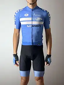 Elastic material used in the fabrics of a summer cycling attire comprising a jersey, bib shorts and gloves.