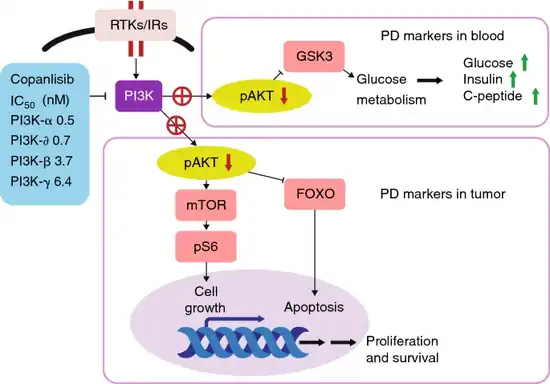 Copanlisib is an inhibitor of phosphatidylinositol-3-kinase (PI3K) with inhibitory activity predominantly against PI3K-α and PI3K-δ isoforms expressed in malignant B-cells. It has been shown to induce tumor cell death by apoptosis and inhibition of proliferation of primary malignant B cell lines.[3]