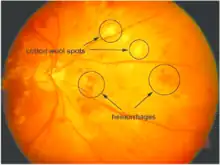 {{cite book}}: CS1 maint: location missing publisher (link) - 1 2 Mansour AM, Jampol LM, Logani S, Read J, Henderly D (August 1988). "Cotton-wool spots in acquired immunodeficiency syndrome compared with diabetes mellitus, systemic hypertension, and central retinal vein occlusion". Archives of Ophthalmology. 106 (8): 1074–1077. doi:10.1001/archopht.1988.01060140230030. PMID 3401133.