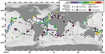 - ↑ Moisander PH, Beinart RA, Hewson I, White AE, Johnson KS, Carlson CA, et al. (March 2010). "Unicellular cyanobacterial distributions broaden the oceanic N2 fixation domain". Science. 327 (5972): 1512–1514. Bibcode:2010Sci...327.1512M. doi:10.1126/science.1185468. PMID 20185682. S2CID 206524855.