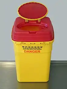 Container for medical sharps and infectious waste - typically found in dental surgeries.