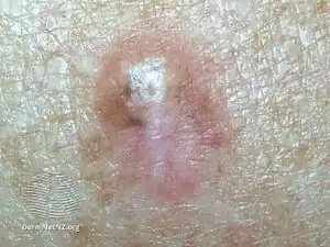 Desmoplastic melanoma is a rare cutaneous condition characterized by a deeply infiltrating type of melanoma[2]: 696 with an abundance of fibrous matrix.[3] It usually occurs in the head and neck region of older people with sun-damaged skin.[3] Diagnosis can be difficult as it has a similar appearance to sclerosing melanocytic nevi as well as some nonmelanocytic skin lesions such as scars, fibromas, or cysts.[3]