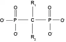 Bisphosphonates mimic the endogenous inorganic pyrophosphate where the oxygen backbone is replaced with carbon (P-C-P for P-O-P). The two additional groups or side chains on the carbon backbone are usually referred to as R1 and R2. R1 is usually a hydroxyl group which enhances the affinity for the calcium by forming a tridentate ligand along with the phosphate groups. The compound can be made more potent by optimizing the structure of the R2 group to best inhibit bone resorption.[13]