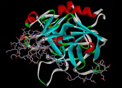 When a blood vessel ruptures or gets injured, factor VII comes into contact with tissue factors which starts a process called the blood coagulation cascade. Its purpose is to stop bleeding and repair tissue damage. When this process is too active due to various problems the risk of blood clots or embolisms increases. As the name indicates the cascade is a multi-step procedure where the main product thrombin is made by activating various proenzymes (mainly serine proteases) in each step of the cascade. Thrombin has multiple purposes, but mainly it converts soluble fibrinogen to an insoluble fibrin complex.[8] Furthermore, it activates factors V, VIII and XI, all by cleaving the sequences GlyGlyGlyValArg-GlyPro and PhePheSerAlaArg-GlyHis, selectively between Arginine (Arg) and Glycine (Gly).[9] These factors generate more thrombin. Thrombin also activates factor XIII that stabilizes the fibrin complex and therefore the clot and it stimulates platelets, which help with the coagulation. Given this broad action of thrombin it stands as a good drug target for anticoagulant drugs such as heparin, warfarin and DTIs and antiplatelet drugs like aspirin.[8][10][11]