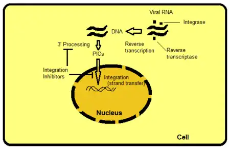 There are several ways to target integrase but strand transfer inhibition is the most intuitively obvious and readily pursued to date. Other targets include, for example, the protein domains beyond the active site of IN. The domains interact with viral or host DNA and are important for binding to the enzyme. It is possible to hamper functions of the enzyme by disrupting or removing these bindings. PIC is a multimeric protein structure inside the host cell, composed of both viral and host proteins. Integrase is a part of PIC's viral component. PIC's viral and host proteins are believed to modulate intrinsic activity of the enzyme, shuttle PIC to the nucleus and direct integration of viral DNA into a transcriptionally active region of the host genome. If it were possible to exclude certain proteins from the PIC it would block the ability of the virus to integrate into the host genome. The process where the retroviral RNA is transcribed to DNA and then integrated into the host cell's genome is shown in figure 2.[8]
