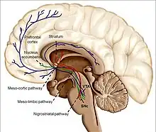 - ↑ Ikemoto, Satoshi (November 2007). "Dopamine reward circuitry: two projection systems from the ventral midbrain to the nucleus accumbens-olfactory tubercle complex". Brain Research Reviews. 56 (1): 27–78. doi:10.1016/j.brainresrev.2007.05.004. ISSN 0165-0173. PMC 2134972. PMID 17574681.
