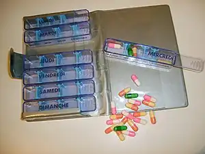 A pill organiser (or pill organizer), pill container, dosette box, pillcase or pillbox is a multicompartment compliance aid for storing scheduled doses of medications. Pill organisers usually have square-shaped compartments for each day of the week, although other more compact and discreet versions have come to market, including cylindrical and pen-shaped cases.[1][2] Some organisers have sections corresponding to times of the day. Pill organisers are viewed as a way to prevent or reduce medication errors on the part of the patient, though evidence of effectiveness is not strong and they have been linked to medication errors.[3]