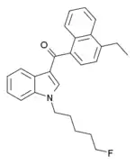 EAM-2201 (4'-ethyl-AM-2201, 5"-fluoro-JWH-210, SGT-14) is a drug that presumably acts as a potent agonist for the cannabinoid receptors.[2] It had never previously been reported in the scientific or patent literature, and was first identified by laboratories in Japan in July 2012 as an ingredient in synthetic cannabis smoking blends[3] Like the closely related MAM-2201 which had been first reported around a year earlier, EAM-2201 thus appears to be another novel compound invented by designer drug suppliers specifically for recreational use. Structurally, EAM-2201 is a hybrid of two known cannabinoid compounds JWH-210 and AM-2201, both of which had previously been used as active ingredients in synthetic cannabis blends before being banned in many countries.