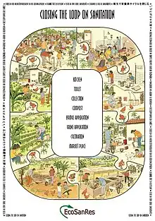 Ecological sanitation, commonly abbreviated as ecosan (also spelled eco-san or EcoSan), is an approach to sanitation provision which aims to safely reuse excreta in agriculture.[1] It is an approach, rather than a technology or a device which is characterized by a desire to "close the loop", mainly for the nutrients and organic matter between sanitation and agriculture in a safe manner. One of the aims is to minimise the use of non-renewable resources. When properly designed and operated, ecosan systems provide a hygienically safe system to convert human excreta into nutrients to be returned to the soil, and water to be returned to the land. Ecosan is also called resource-oriented sanitation.