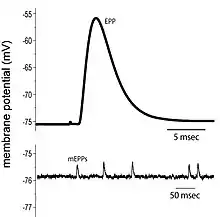 End plate potentials (EPPs) are the voltages which cause depolarization of skeletal muscle fibers caused by neurotransmitters binding to the postsynaptic membrane in the neuromuscular junction. They are called "end plates" because the postsynaptic terminals of muscle fibers have a large, saucer-like appearance. When an action potential reaches the axon terminal of a motor neuron, vesicles carrying neurotransmitters (mostly acetylcholine) are exocytosed and the contents are released into the neuromuscular junction. These neurotransmitters bind to receptors on the postsynaptic membrane and lead to its depolarization. In the absence of an action potential, acetylcholine vesicles spontaneously leak into the neuromuscular junction and cause very small depolarizations in the postsynaptic membrane. This small response (~0.4mV)[1] is called a miniature end plate potential (MEPP) and is generated by one acetylcholine-containing vesicle. It represents the smallest possible depolarization which can be induced in a muscle.