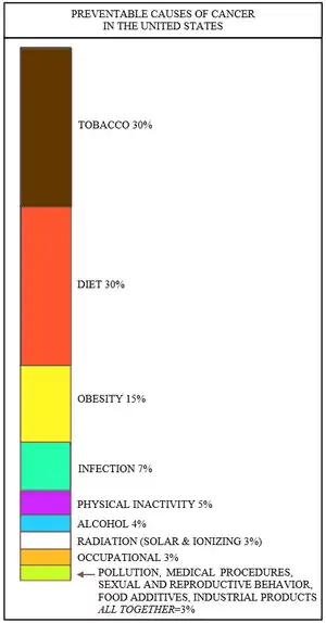 The approximate relative levels of the preventable causes of cancer in the United States, taken from the article Cancer prevention.