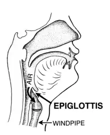 During swallowing, the epiglottis bends backwards, folding over the entrance to the trachea, and preventing food from going into it.[2] The folding backwards is a complex movement the causes of which are not completely understood.[2] It is likely that during swallowing the hyoid bone and the larynx move upwards and forwards, which increases passive pressure from the back of the tongue; because the aryepiglottic muscles contract; because of the passive weight of the food pushing down; and because of contraction of laryngeal and because of contraction of thyroarytenoid muscles.[2] The consequence of this is that during swallowing the bent epiglottis blocks off the trachea, preventing food from going into it; food instead travels down the esophagus, which is behind it.[3]