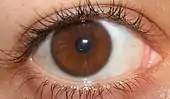 Almost all mammals have brown or darkly-pigmented irises.[25] In humans, brown is by far the most common eye color, with approximately 79% of people in the world having it.[26] Brown eyes result from a relatively high concentration of melanin in the stroma of the iris, which causes light of both shorter and longer wavelengths to be absorbed.[27]