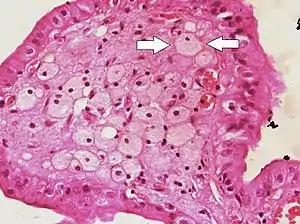 ![]() Foam cells (one indicated by arrows) visible in the finger-like projections into the gallbladder lumen in a case of cholesterolosis | |